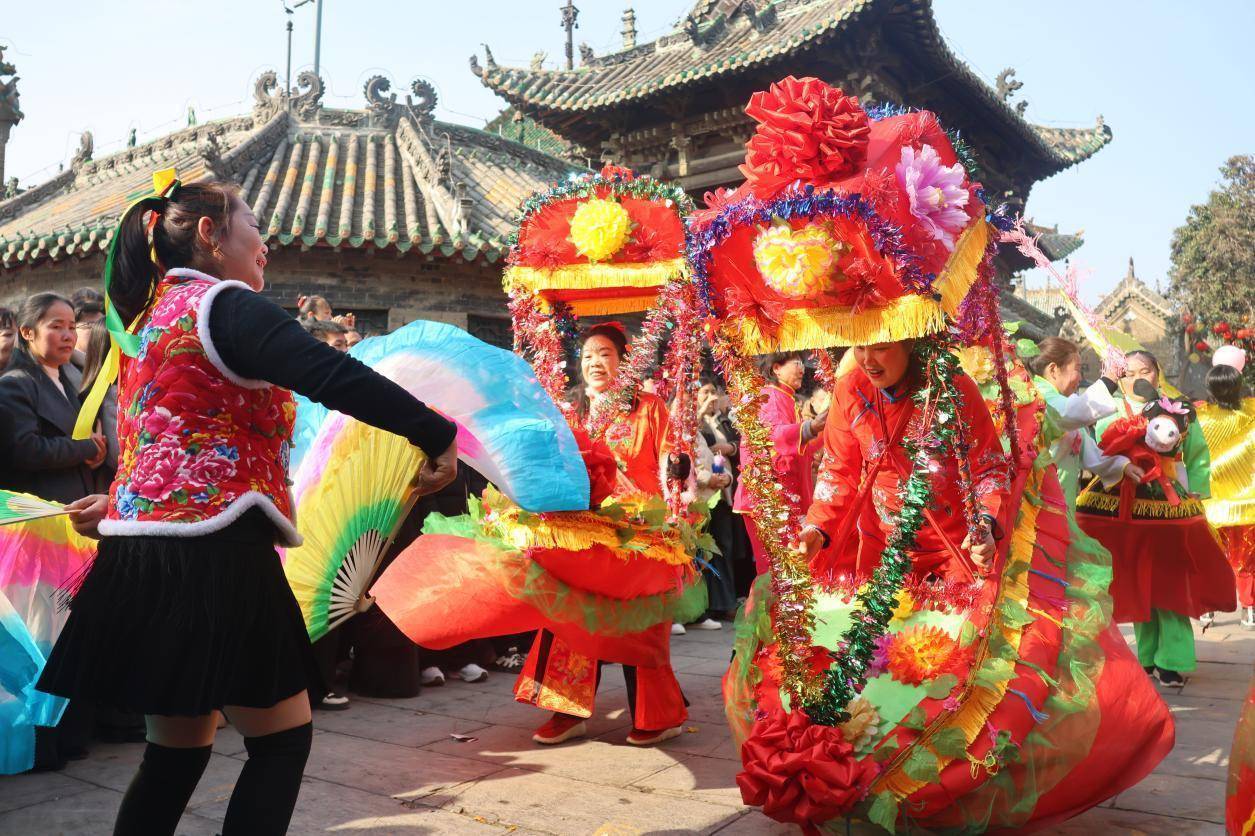 南阳市社旗县赊店古镇的庙会现场,东谈主们通过划旱船、舞龙狮、奏古筝等,庆祝春节。张新军摄