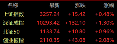 沪指涨0.48%,深证成指涨1.3%,创业板指涨2.08%。影视院线、电板、铜缆高速相连板块涨幅居前,小红书主见、互联网电商、贵金属板块走低。