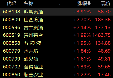 迎驾贡酒涨超3%,古井贡酒、山西汾酒涨超2%,水井坊、贵州茅台、五粮液等跟涨。