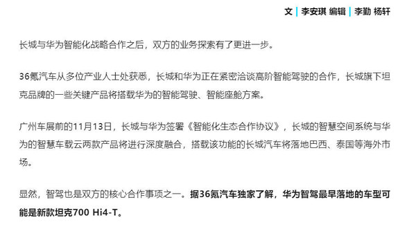 传长城汽车将引入华为智能驾驶 新款坦克700搭载开云体育