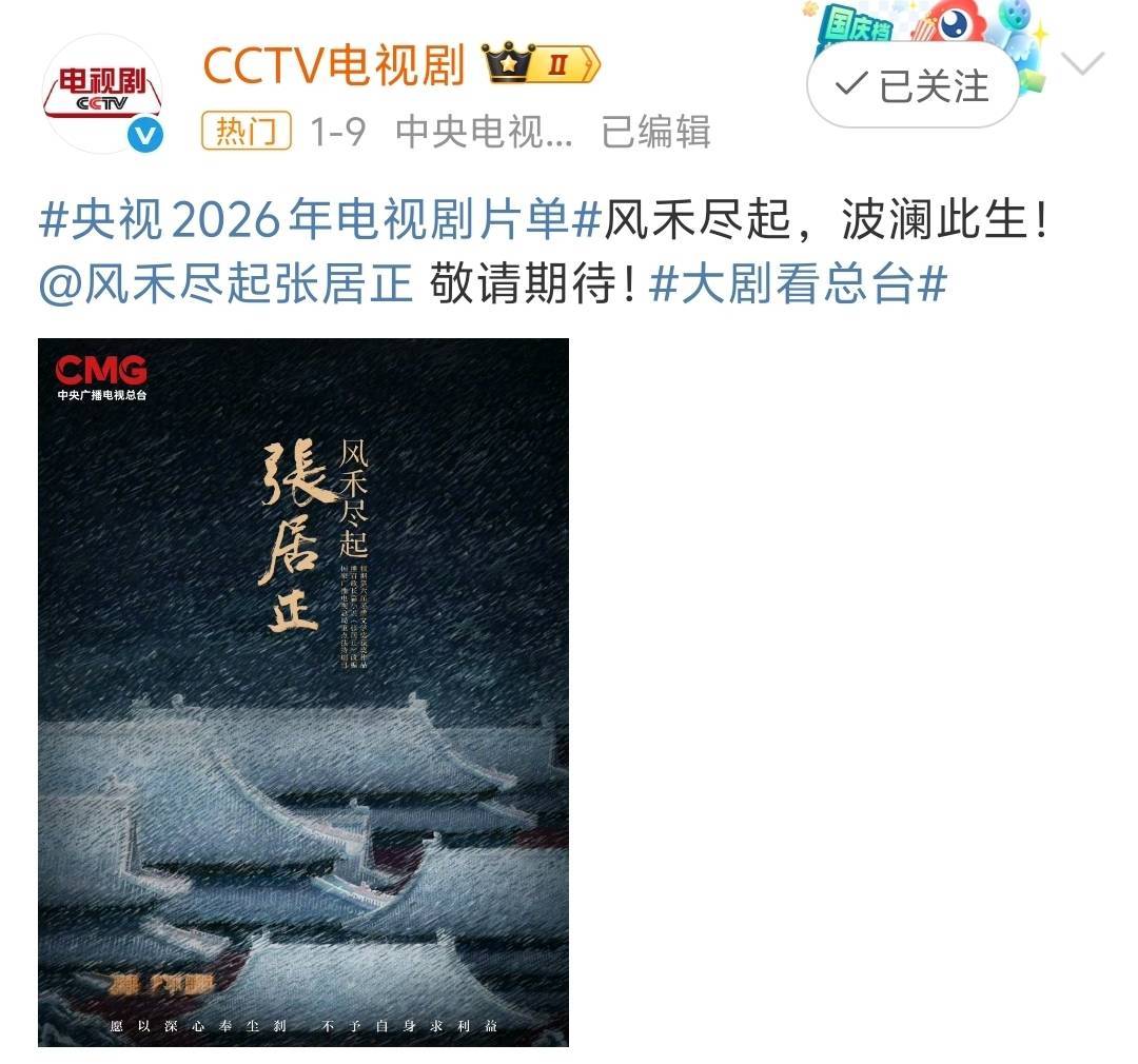 终于,当今有一部或可扛起历史剧大旗的重磅之作来袭,现时仍是加入了央视2026年片单——《风禾尽起张居正》。