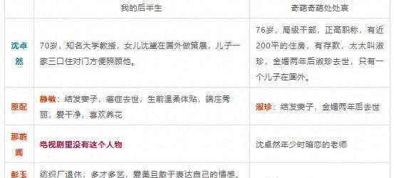 那蔚阗 电视剧里莫得这个东说念主物 ,那蔚阗是沈卓然少小时暗恋过幻想过的真挚。 彭玉兰 原著里莫得这个东说念主物 ,彭玉兰是沈诠释亲家母的老共事,特别仰慕沈诠释的学识风范,然则我们沈诠释对这么特等正常的、不图什么的彻底不回电,这部分电量王人在静敏(淑芬)那边耗光了。