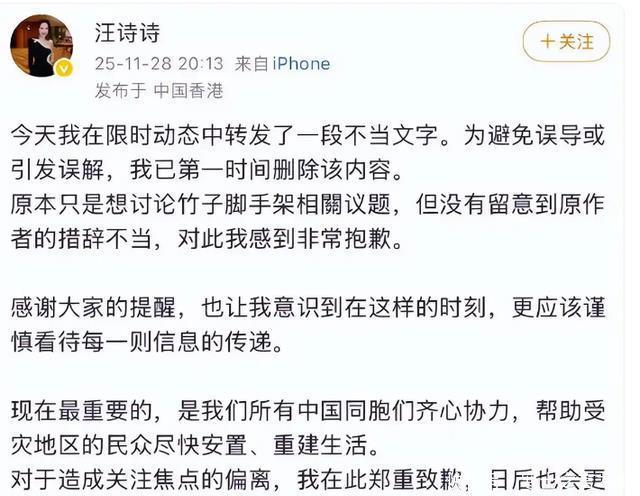 跟着事情的逐渐发酵,汪诗诗的发言遭到了无边网友的约束。 眼看事情朝着弗成控的场地发展,汪诗诗很快就聘用发文说念歉。 仅仅她的说念歉并不真挚,反倒再次展现了我方的双标行为。