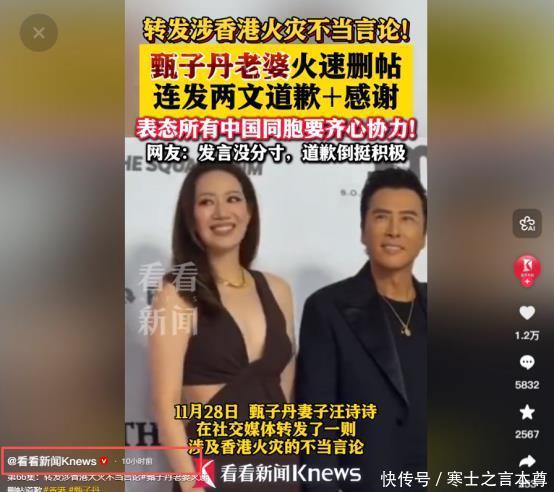 信息着手 望望新闻2025-11-29《转发涉香港失火不当言论!甄子丹妻子火速删帖连发两文说念歉+感谢 表态通盘中国同族要王人心合力!网友:发言没分寸。说念歉倒挺积极》