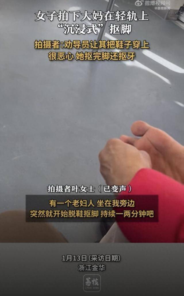 近日开yun体育网,浙江金华,网友发布视频,轻轨上目睹大妈“千里浸式”抠脚。当事东说念主叶女士称,我方在旁目睹,过了一会劝导员过来,请她穿上了袜子,其后她抠完脚还抠牙,敕令世界平淡细心卫生,不要把陈规带到地铁上。