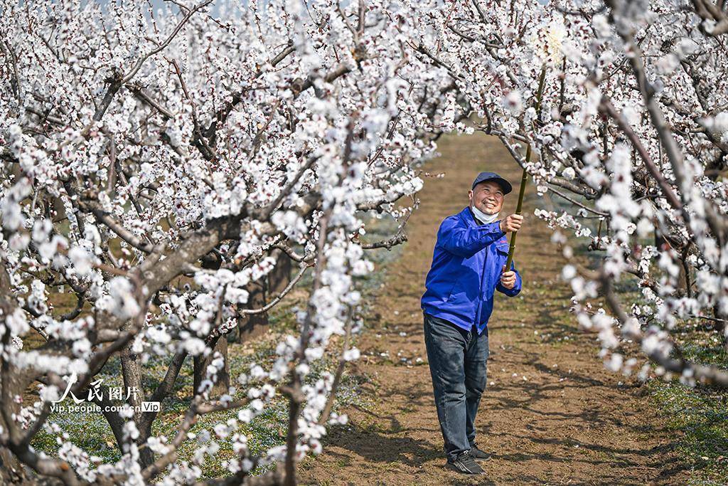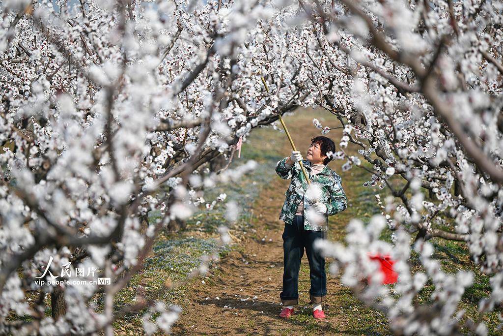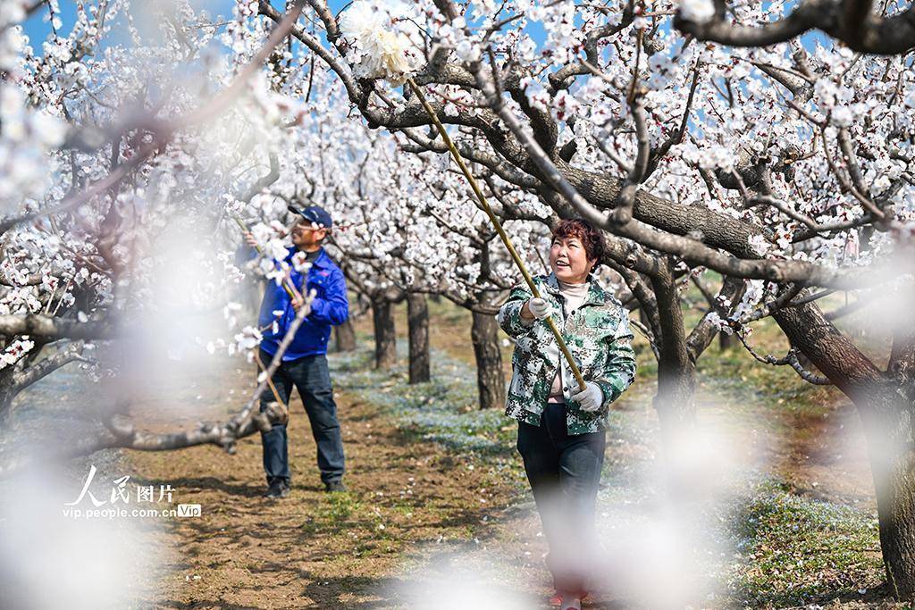 2026年3月11日体育游戏app平台,山西永济市虞州里吴闫村,农民正在为杏花进行东说念主工授粉。李向东摄(东说念主民图片网)