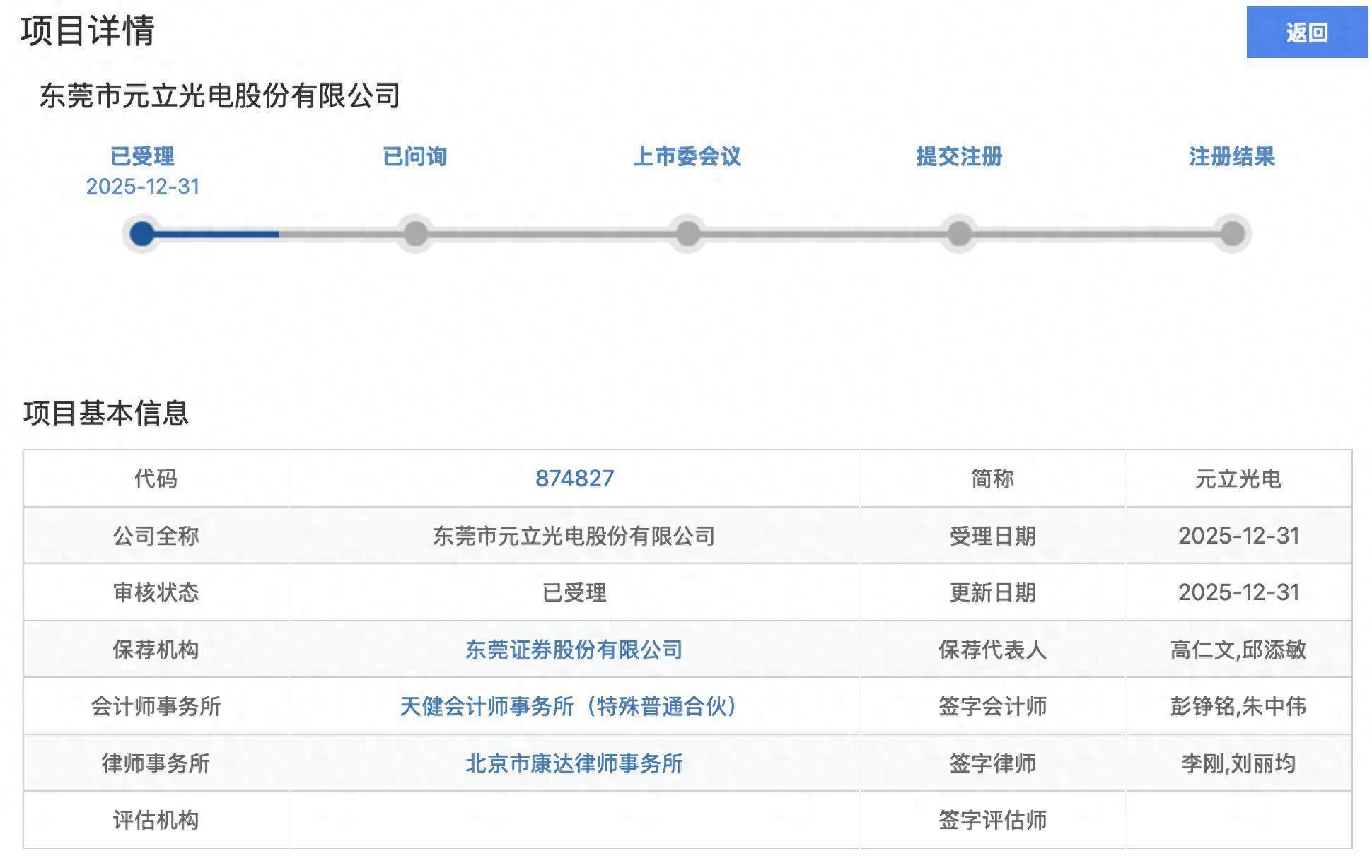 2025年终末一天,北交所团结受理了多宗IPO。其中,东莞市元立光电股份有限公司(简称“元立光电”)IPO得回受理,保荐机构为东莞证券股份有限公司。